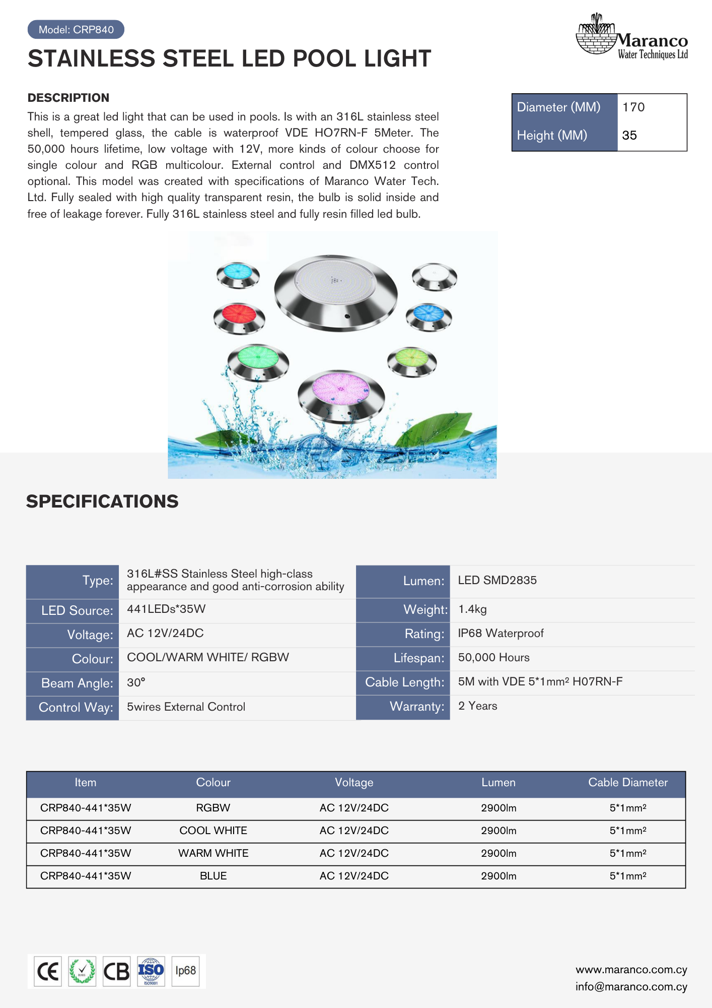 This is a great led light that can be used in pools. Is with an 316L stainless steel shell, tempered glass, the cable is waterproof VDE HO7RN-F 5Meter. The 50,000 hours lifetime, low voltage with 12V, more kinds of colour choose for single colour and RGB multicolour. External control and DMX512 control optional. This model was created with specifications of Maranco Water Tech. Ltd. Fully sealed with high quality transparent resin, the bulb is solid inside and free of leakage forever. Fully 316L stainless steel and fully resin filled led bulb.