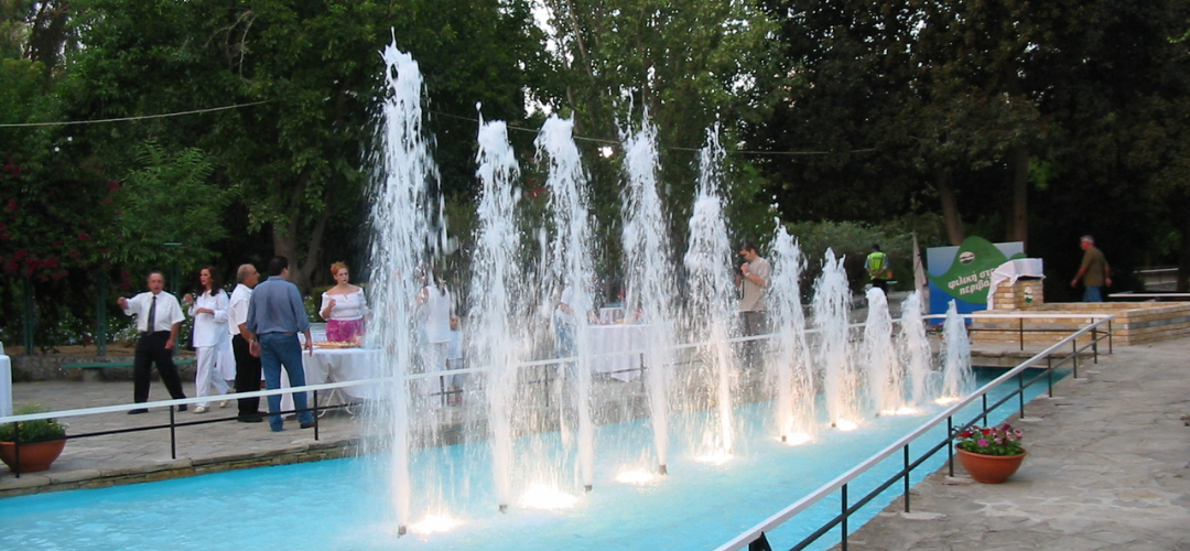 This is a decorative water fountain of the “choreographed jet” type (dancing fountain), ideal for public spaces, hotels, or amusement parks. It features a central vertical high-intensity jet, surrounded by curved side jets that create symmetry and dynamic movement in the water. The basin is coated with a vivid blue material that highlights the water’s clarity and brilliance, while the lighting system with underwater spotlights provides warm, atmospheric light. The fountain includes a perimeter railing for safety and separation from the public. An elegant and functional water feature, ready to aesthetically enhance any outdoor environment.