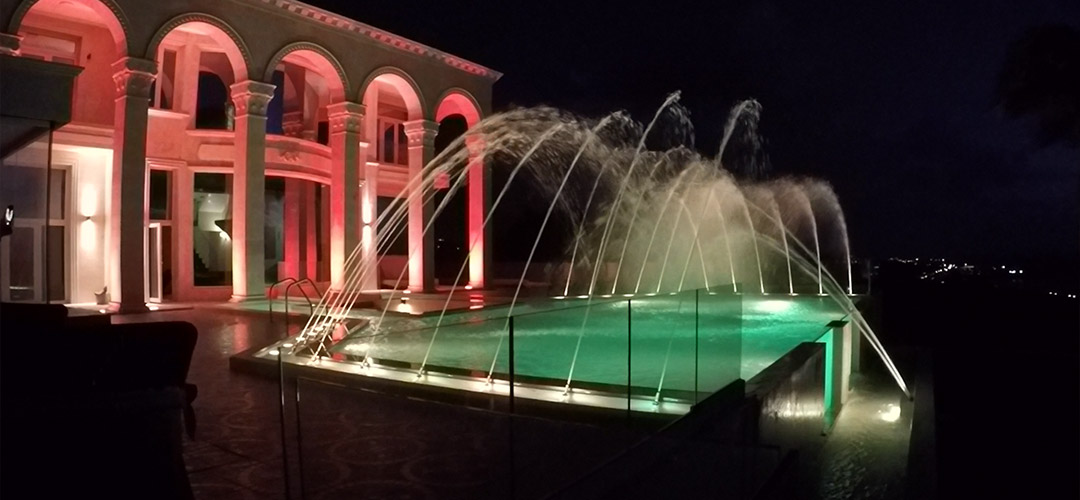 A swimming pool in Private Residence in Pegeia, Paphos. Swimming pools with fountain combine the refreshing functionality of a pool with the aesthetic and sensory appeal of water features. These pools in corporate various types of fountains such as cascading waterfalls, laminar jets, bubbling jets, or spray arcs, creating a luxurious atmosphere. A fountain can be position at pool edges integrated into walls or centrally placed.
